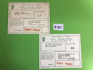 County Borough of Southport, Great Flower Show Prize cards, awarded to Earl of Rosebery, Mentmore. X1 of 1960, X1 0f 1961 |