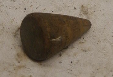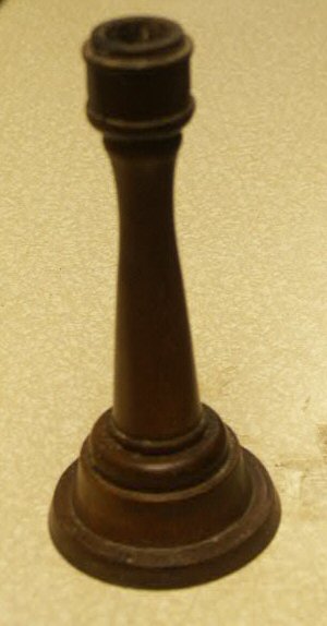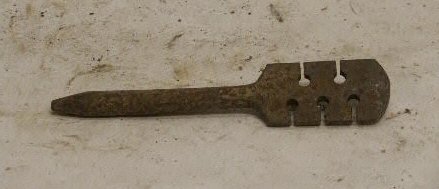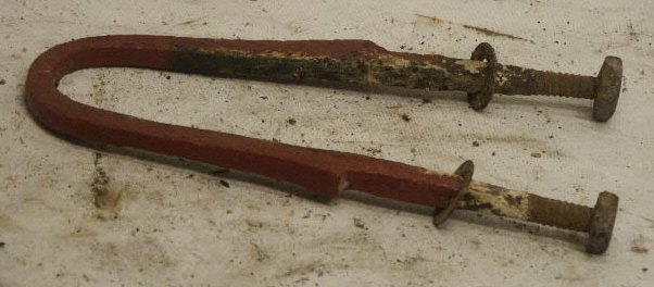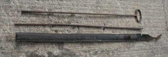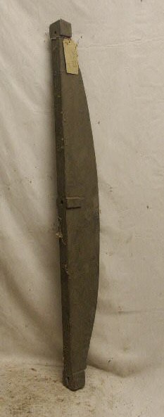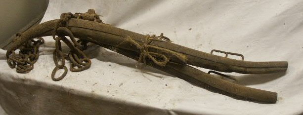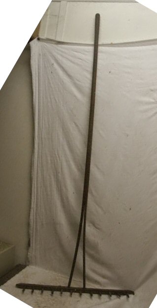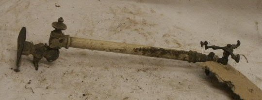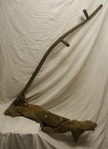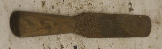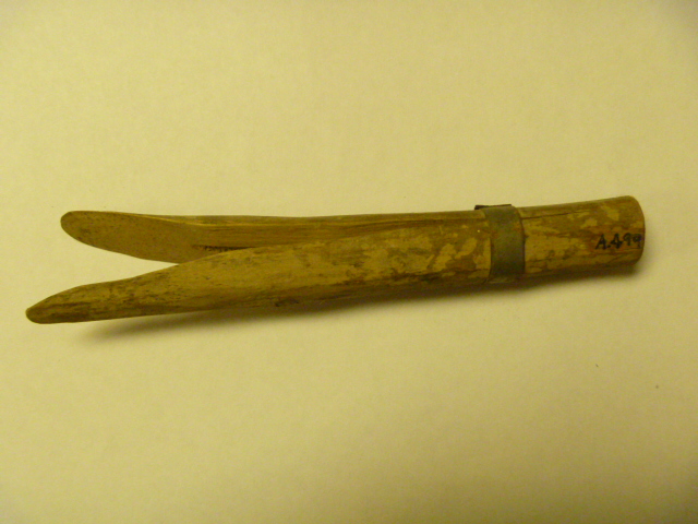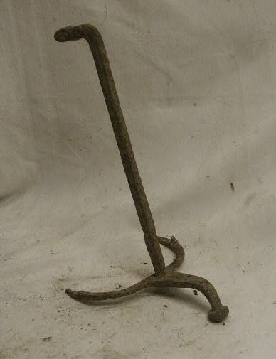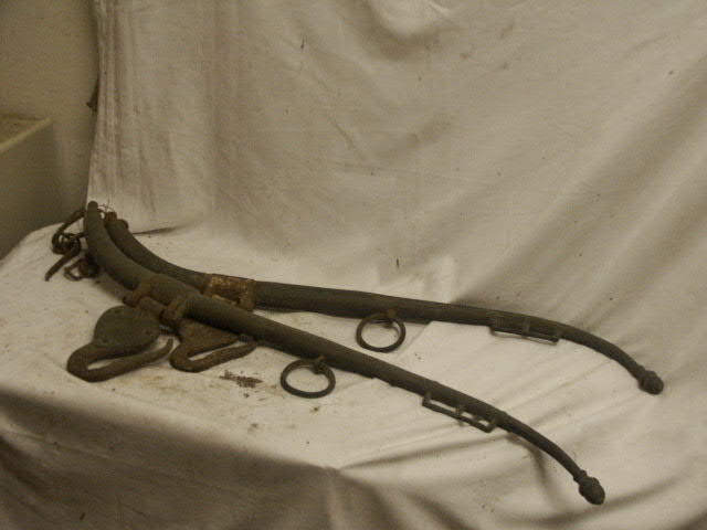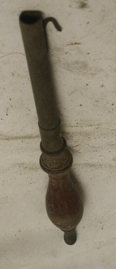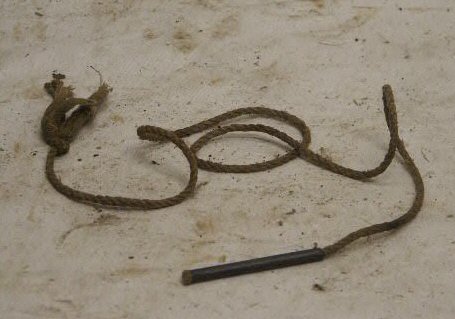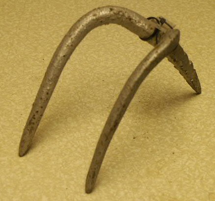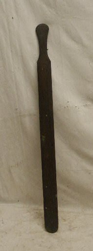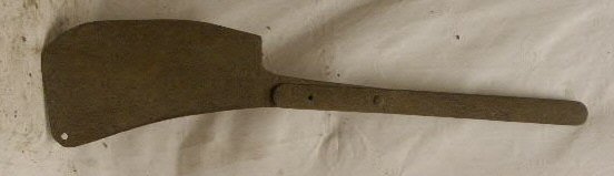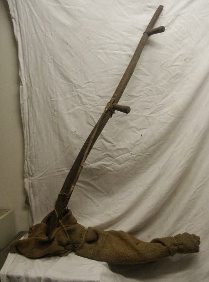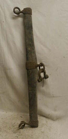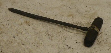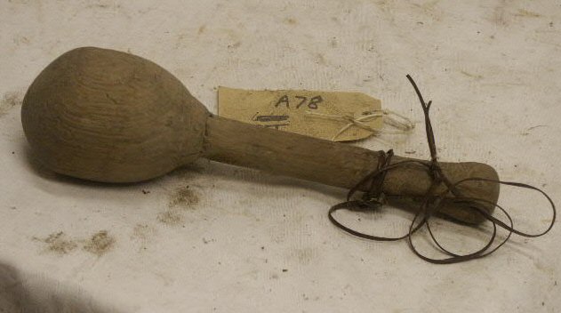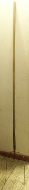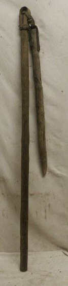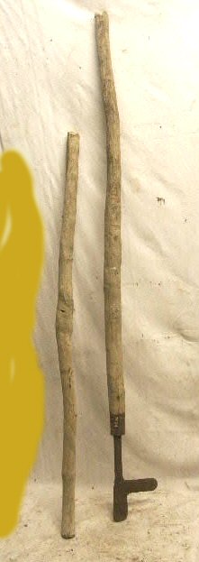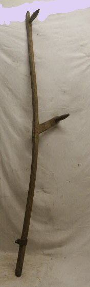 used by beating flail on corns spread on barn floor long wooden pole with metal cap on end and leather thongs holding a wooden ring onto it. This is atached to a much shorter pole by means of a double leather thong between the poles. |