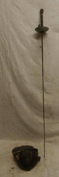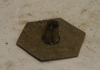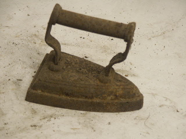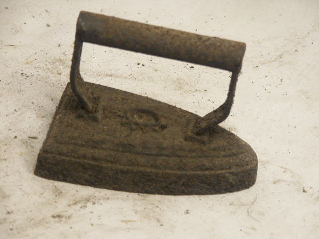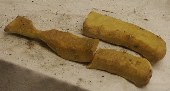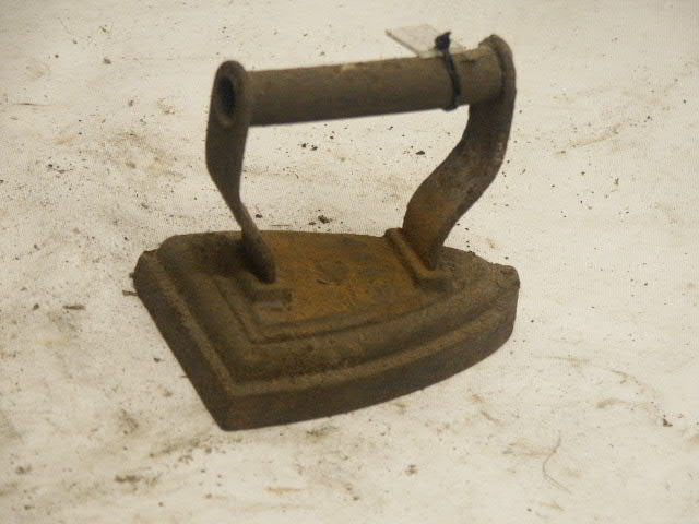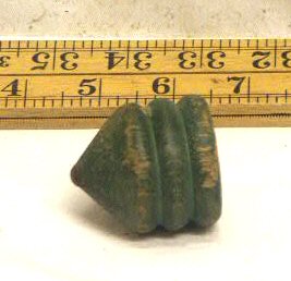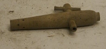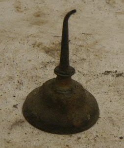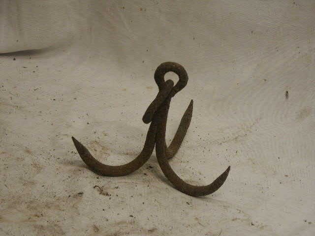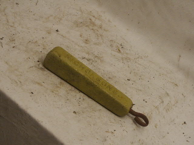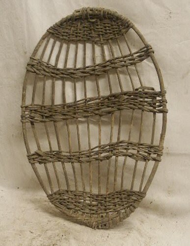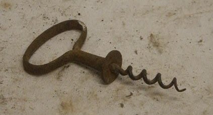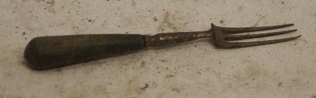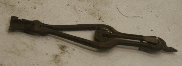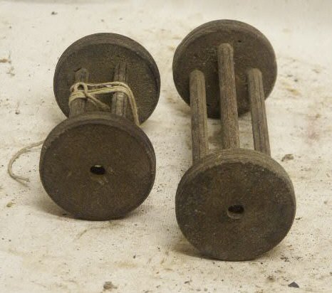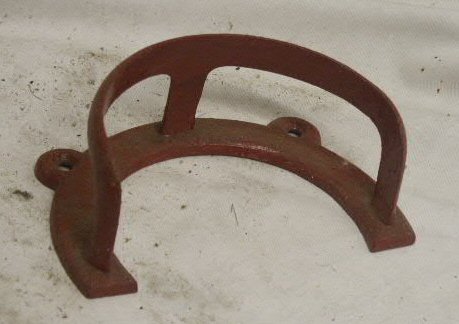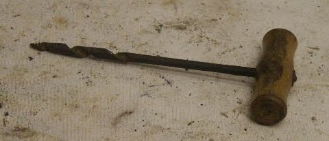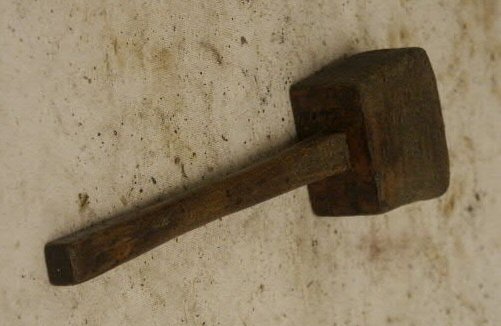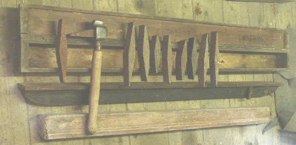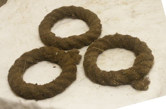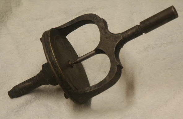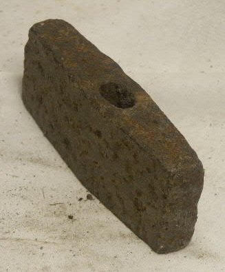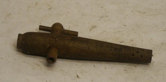 used by beating flail on corns spread on barn floor long wooden pole with metal cap on end and leather thongs holding a wooden ring onto it. This is atached to a much shorter pole by means of a double leather thong between the poles. |