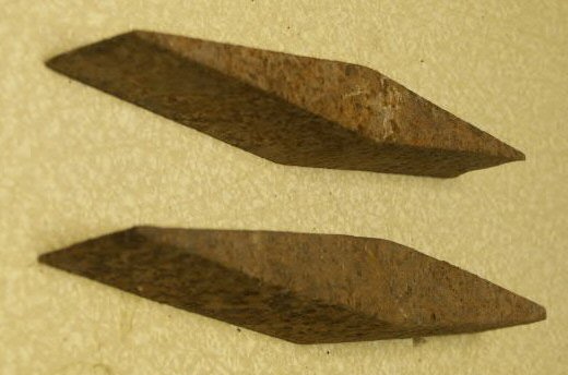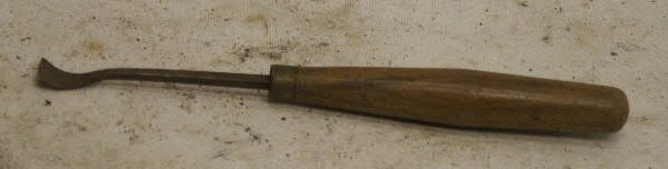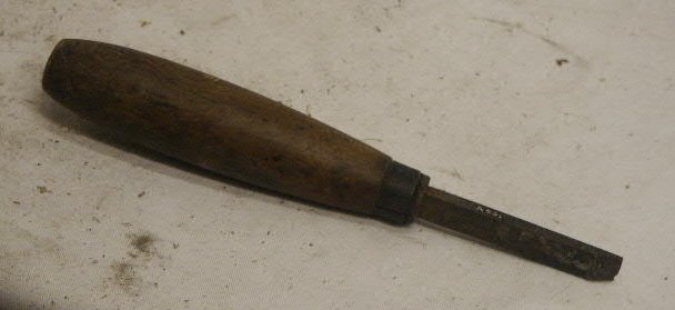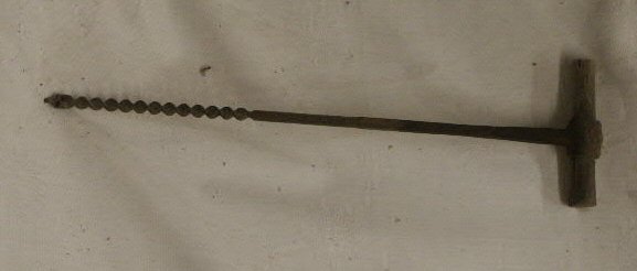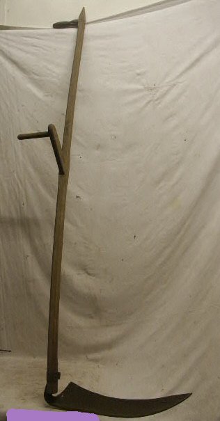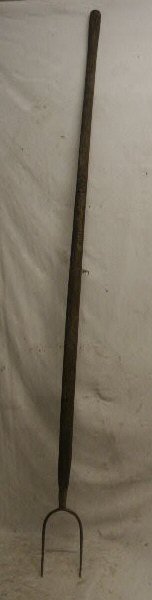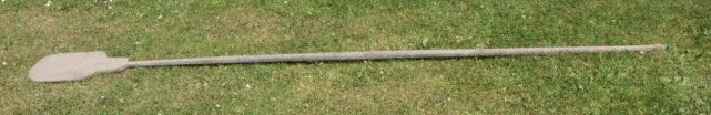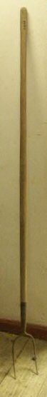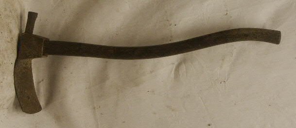 for digging up or severing the roots of weeds Long rough wormy wooden helve bound at far end with metal ring with metal ring set into it. Blade is straight and narrow, rectangular bar, slightly rounded and sharpened at end, and with similar bar protrudin |