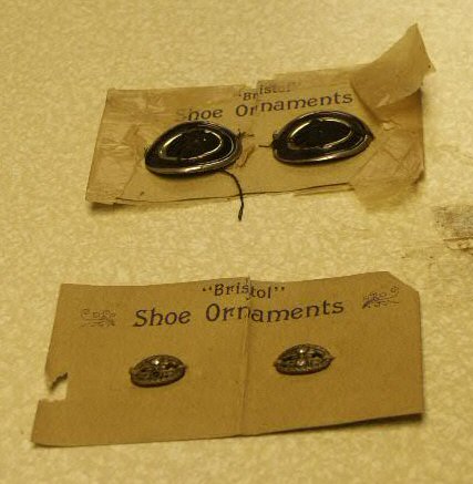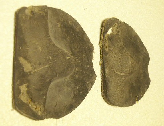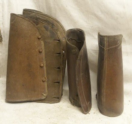 two pairs of leather gaiters one in bad condition. One small pair, fastened by buckles and leather straps at top and metal hook and eye at bottom. Other larger pair is fastened by buttons. One of these latter gaiters has large hole in main part of leg, w |