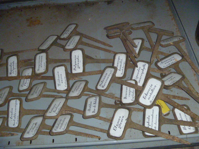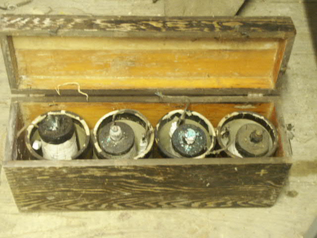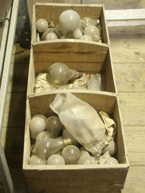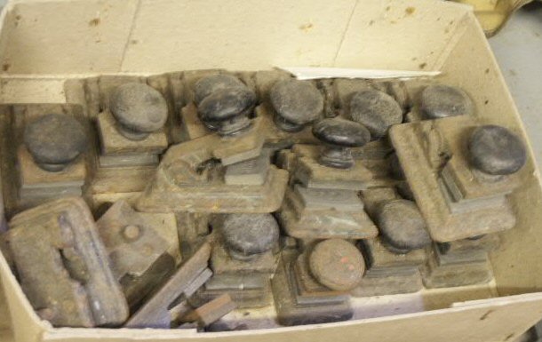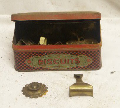 collection old drawer knobs, picture hasngers etc in Sanders biscuit tin |