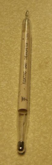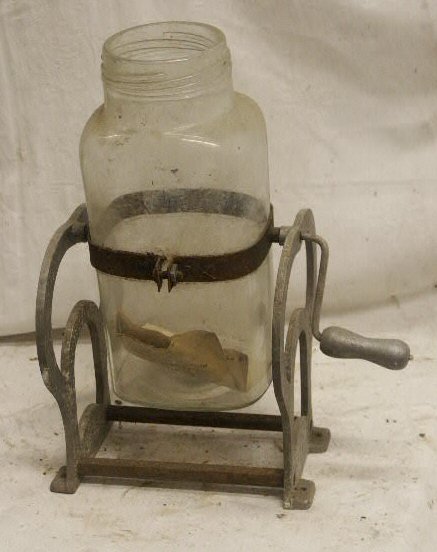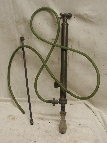 garden syringe; one hand holds body whilst the other hand pumps the wood handle |