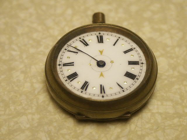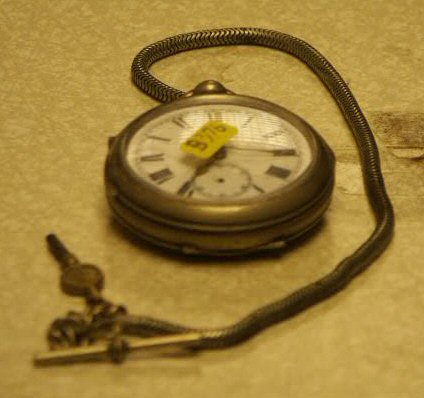 watch on chain with key; simple pocket watch but heavy second hand missing. roman numerals.snake chain |