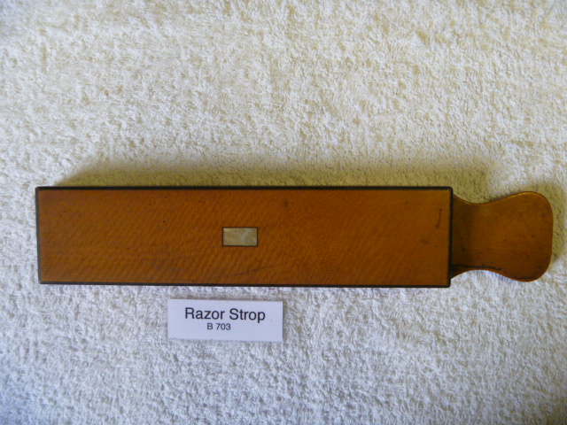 | B703 | Domestic | Razor strop | Razor strop in wooden case hinged at one end. Pear shaped handle with 3/4x1/2 inch mother of pearl insert on front.Fawn colour. | CC Bay 6 | |
