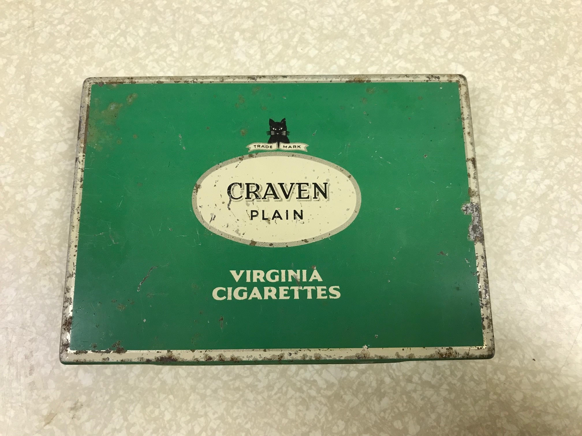 | B708 | Containers | Cigarette Tin | 50 place cigarette tin Tin originally containing -Craven Plain- cigarettes. Green with black and white lettering and -Black cat- trade mark. Inside lid black lettering explaining difference between-Craven Plain- and -Craven -A-cigarettes. Datails of makers repeated on back of hinged lid. | ![]() |