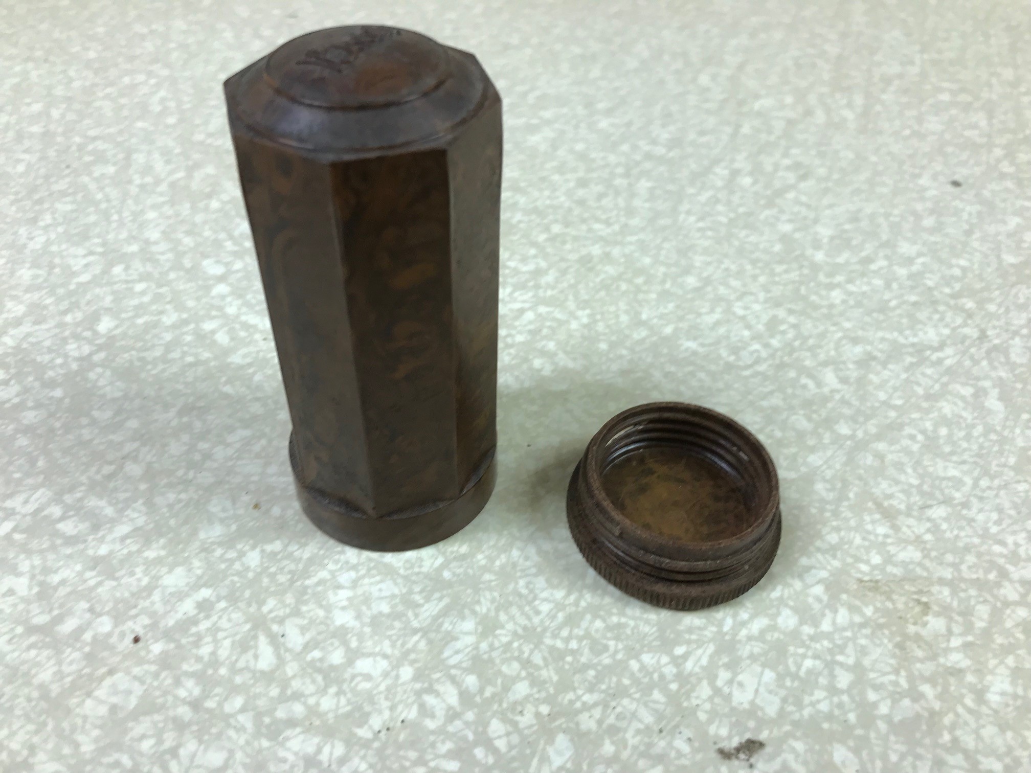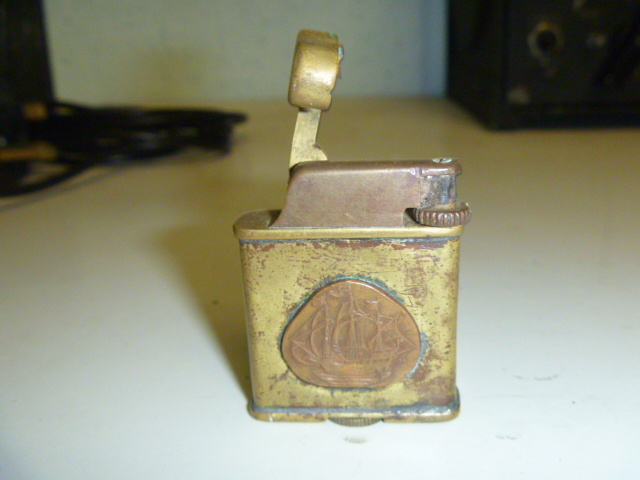 | C997 | Scientific Instruments | cigarette lighter | Brass cigarette lighter surmounted with device from old 1/2 d coin. Probably an example of "trench art"? | CC Bay 6 | |
