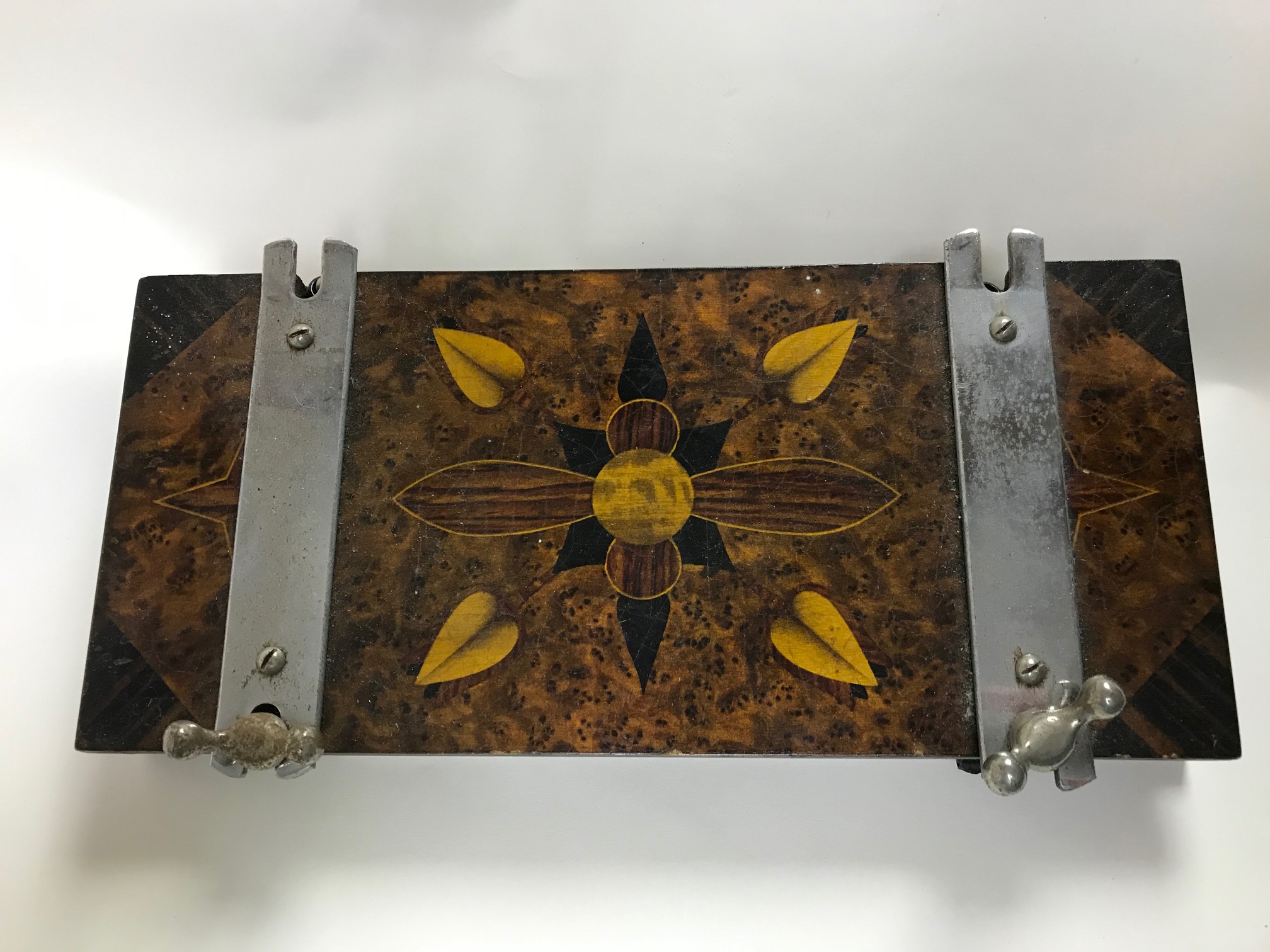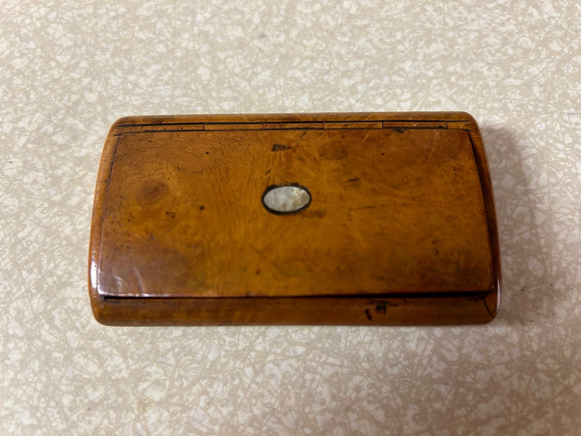 | E548 | Domestic | Wooden Box | Small, burr walnut, wooden box with mother of pearl inlay. | ![]() |