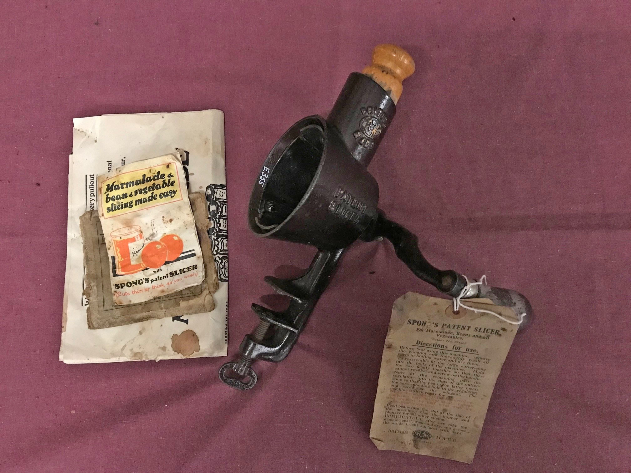 | E355 | Domestic | Slicer | Spong No 361 Patent Slicer for Marmalade Beans and all Veg. With Labels and instruction booklet. | ![]() |