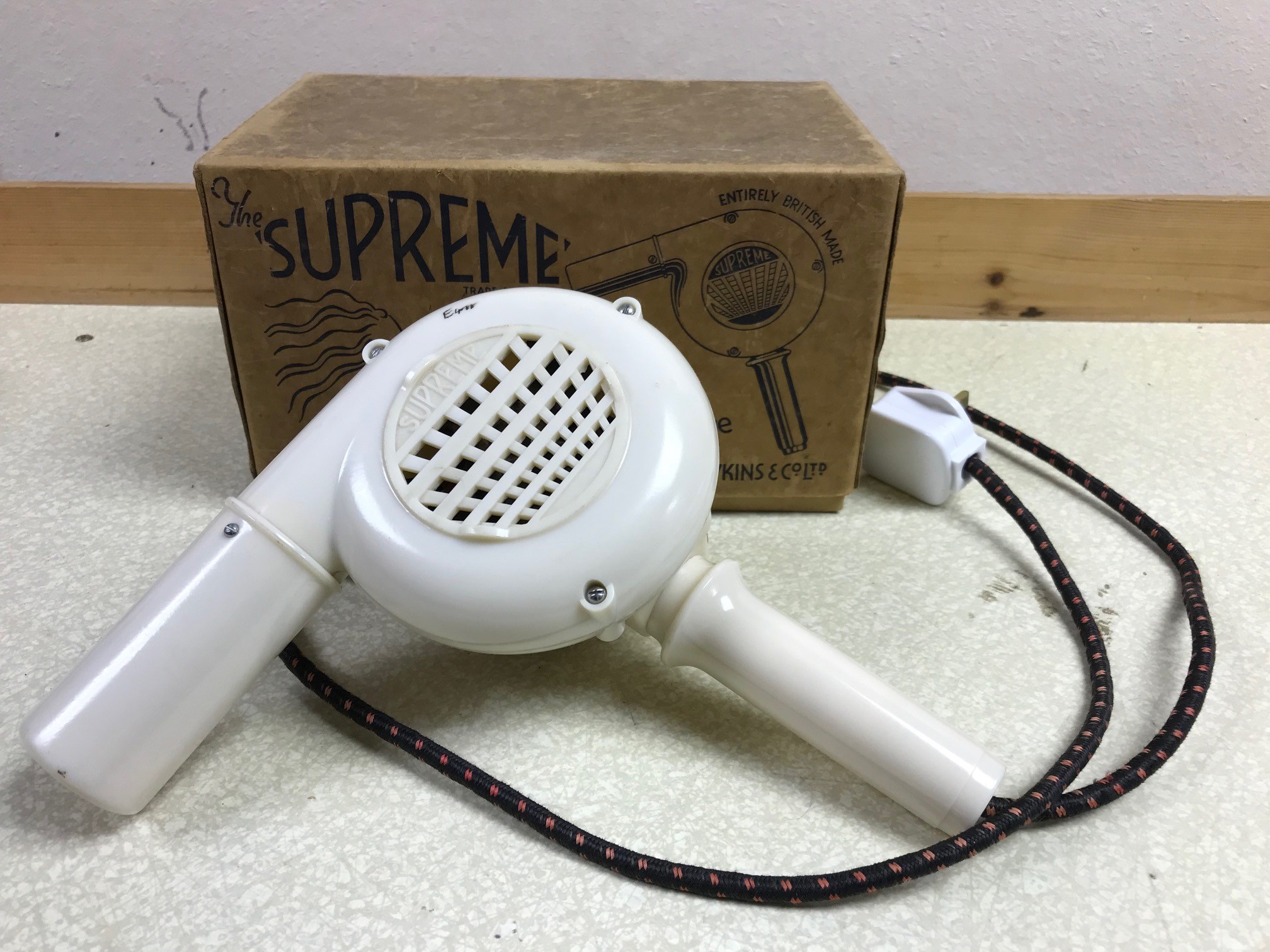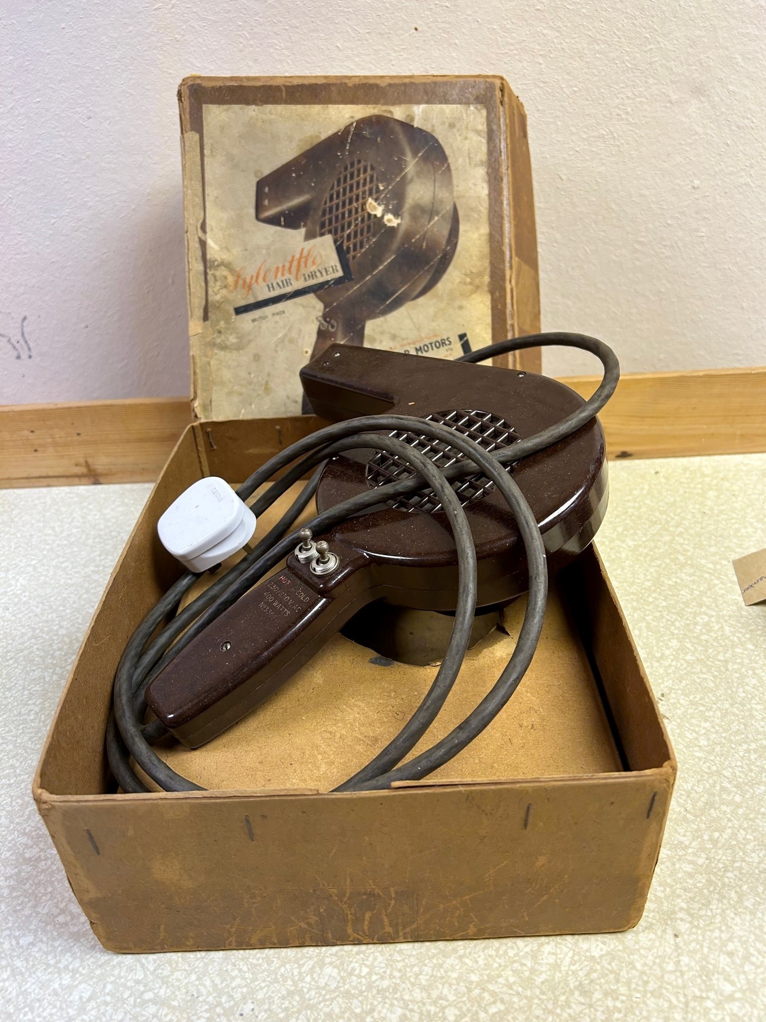 | E411 | Domestic | Hairdryer | Vintage 1950s Supreme Cream Hairdryer - Bakelite- by Hawkins & Co in original Box, | ![]() |