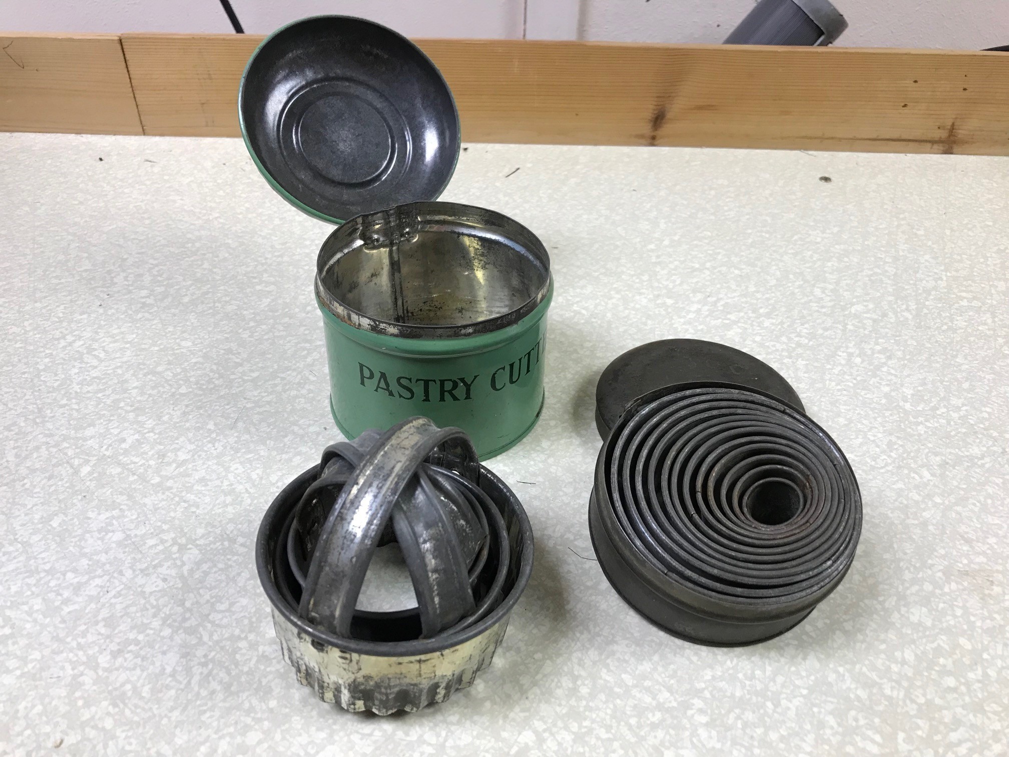 | E419 | Domestic | Pastry Cutters | Pastry Cutters. /1 Green Tin with 3 flutted cutters. /2, tin with 12 cutters | ![]() |