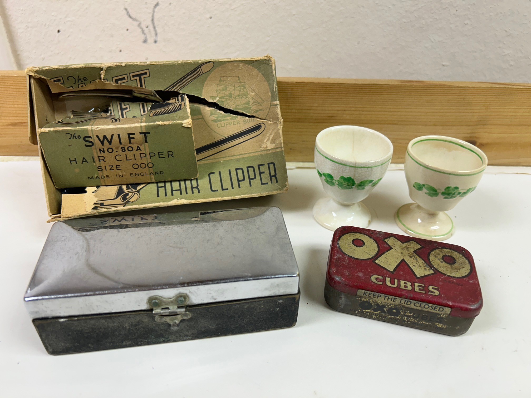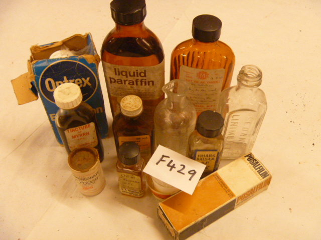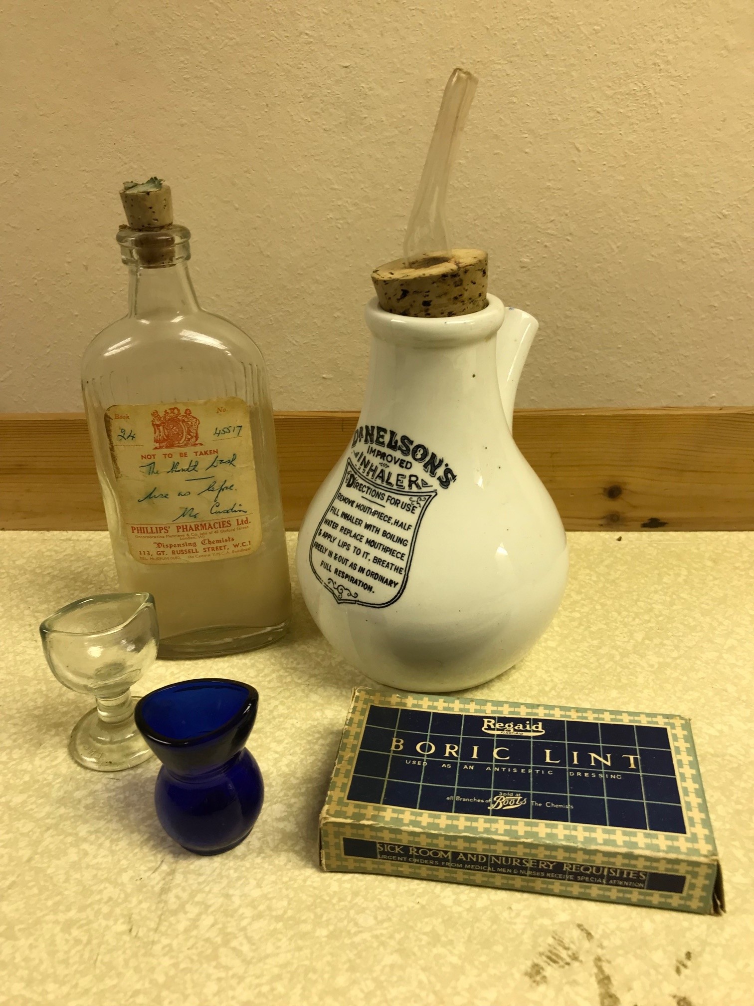 | E432 | Domestic | Chemist Items | Medicine bottle,eye wash glasses, Dr Nelsons inhaler | ![]() |