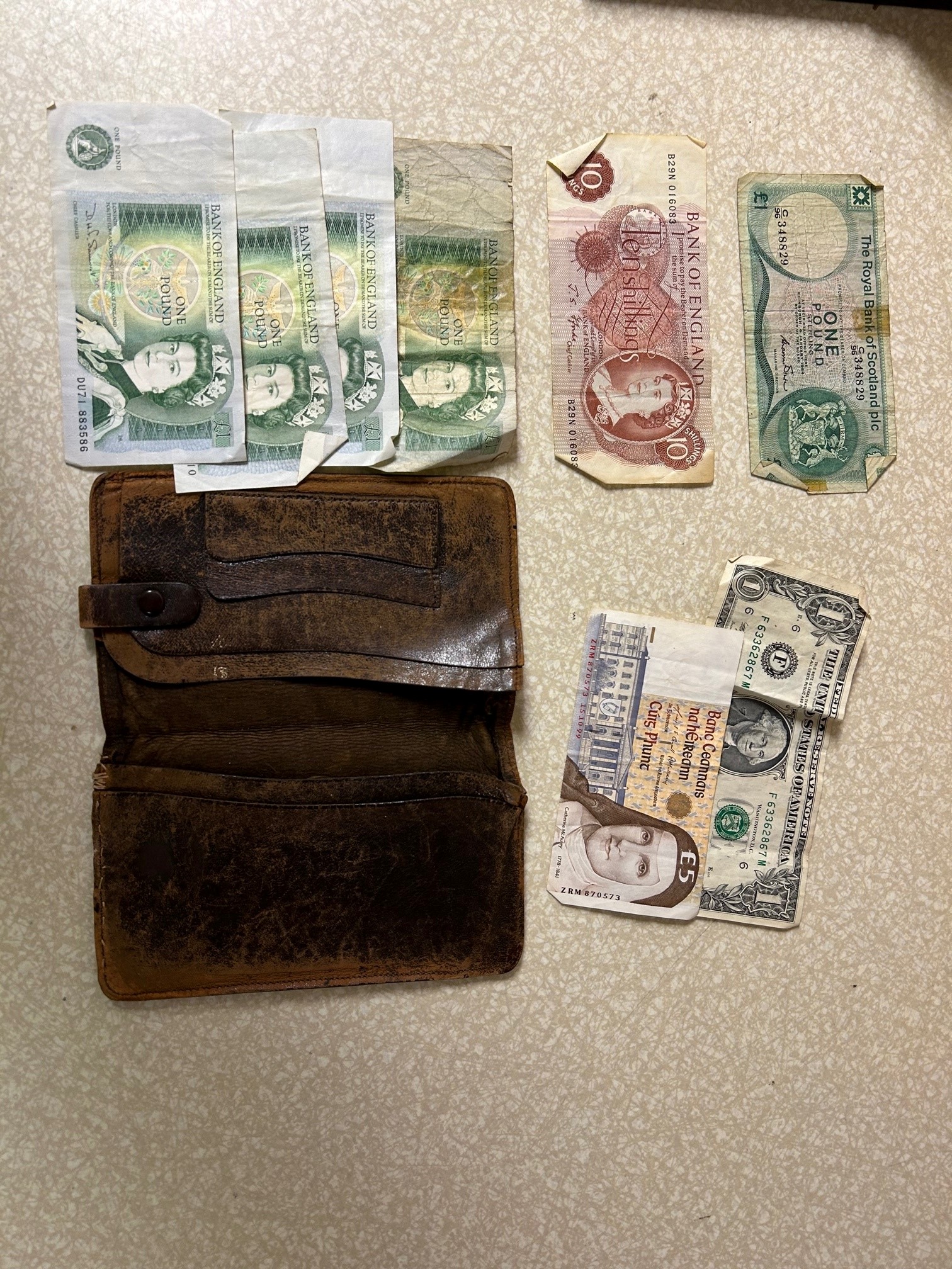 | E529 | Money | Wallet & Notes | Old leather wallet with 4x£1 notes,10/- note, Scottish £1 note, Irish £5 note, USA 1 Dollar. | ![]() |