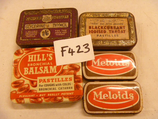 | F423 | Home | sweet tins | various throat sweet tins x5 | CC Bay 6 | |