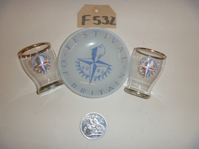 | F532 | memorabilia | Festival of Britain memorabilia, ash tray, x2 glasses, Coin | CC Bay 6 | ||