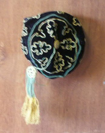 Straw filled, bolster style, lace makers pillow on wooden stand. |