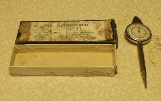 Tool with 3 functions; compass, map measurer and pencil silver coloured pencil with compass and map measurer in the top; with original box. |