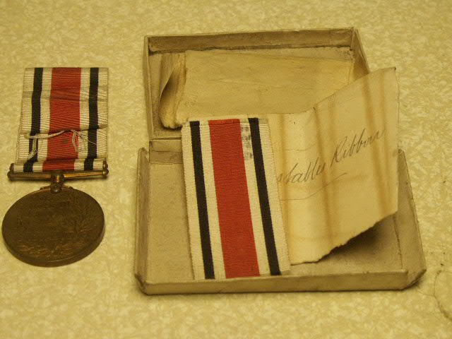 Bronze police medal with red, black and white ribbon; has King George 5th head and writing engraved on one side and ,For faithful service in the special constabulary on the other; a small white box has Mr West,s name printed |
