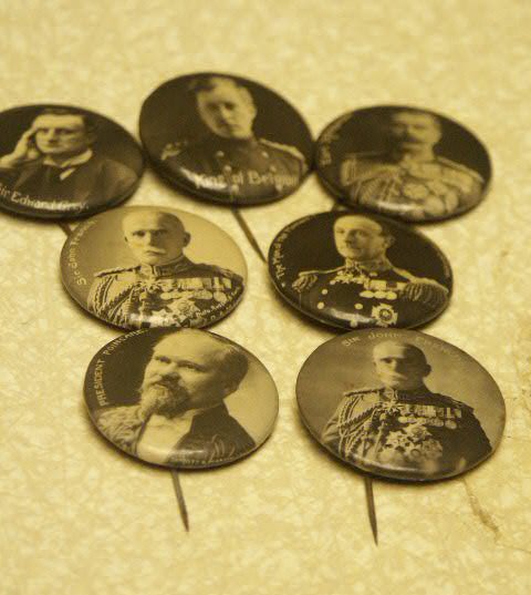 Seven lapel badges bearing portraits of notable people of the time of World War One |