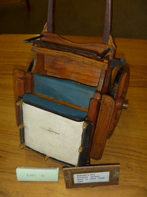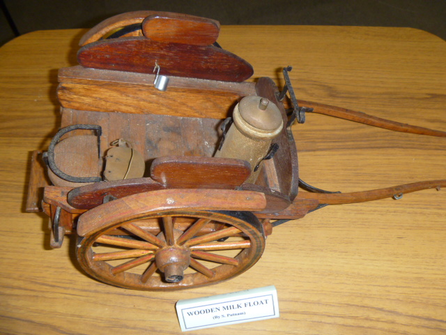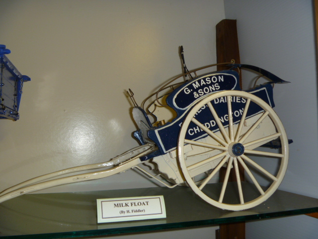 Model milk float Milk Float. 2 wheeler. White with blue side panels inscribed "G. Mason and sons. Express dairies, Cheddington" Front panel blue with white inscription "G. Mason and sons. Dairyman" Mounting step at rear. Metal mudguards and handrails wit |