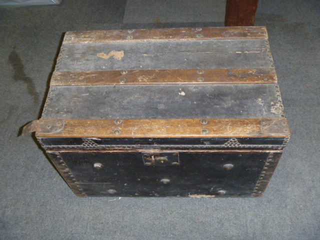 Large wooden lockable trunk, black with studs and wood protection strips on top |